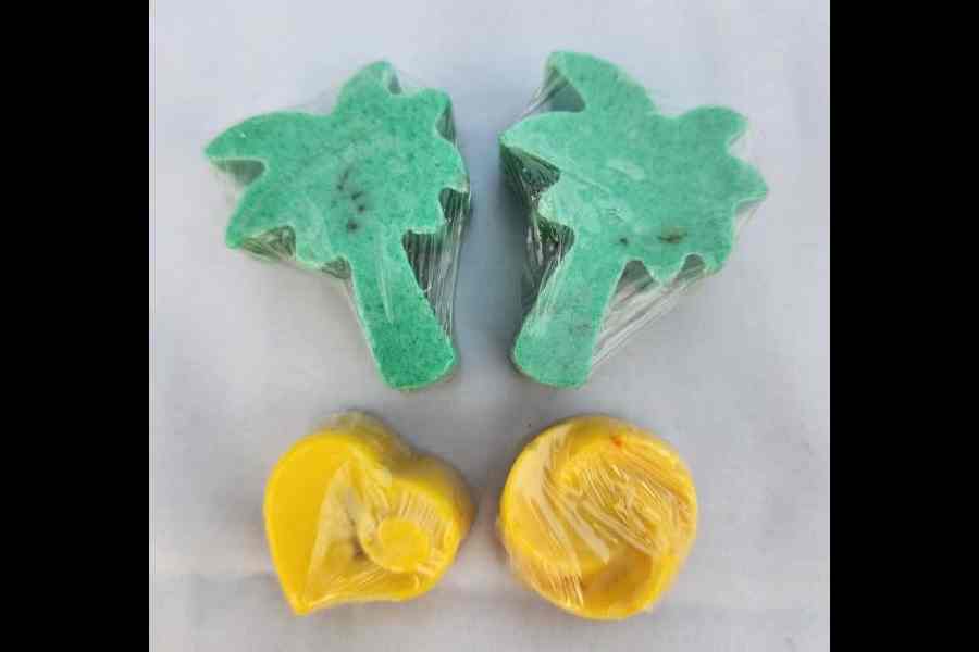 What: The bestsellers at this home-made chocolate stall are mango-chilli and paan chocolates. “The mango chilli variant opens with a fruity note but an aftertaste of chilli follows,” says chocolatier Sonali Dutta, who lives opposite Snehodiya in New Town. “The paan chocolate is filled with gulkand. I use white chocolate as the base so the mango’s yellow and the paan’s green can be visible when blended.”
