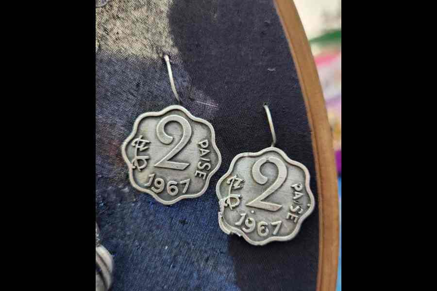The earrings are made using replicas of two and five paisa coins. “They aren’t real coins — they’re made of German silver — but the designs match the originals,” she explains.