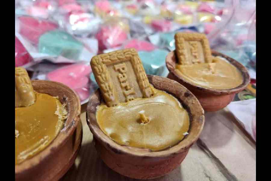 What: This stall offers candles in various shapes and colours, but the most eye-catching one resembles a biscuit partially dipped in an earthen cup of tea. “The candle is scented with saffron. We also make decorative pieces from uncommon items like fish scales, but the tea-and-biscuit candle is our new creation this year,” says Rumpa Guchhait from East Midnapore.