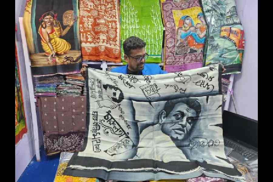 What: Goutam Manna has brought silk saris, hand-painted with bold motifs of Rabindranath Tagore, Uttam Kumar and Satyajit Ray. The Ray sari features his portrait, the names of his films, and outlines of iconic images such as Charulata holding her binoculars.