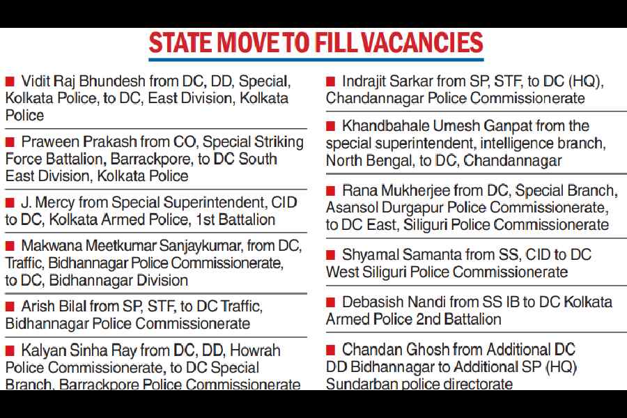 The posts include deputy commissioners for the south-east and east divisions of Kolkata Police, and deputy commissioners for two battalions of the Kolkata Police armed force. “Some key posts of deputy commissioners of Kolkata Police, Bidhannagar police, Chandannagar, Barrackpore and Siliguri are lying vacant after the recent transfers,” said an official of the state home department.
