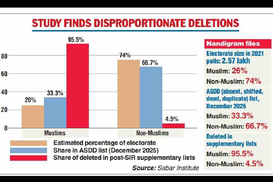 “The staggering rate of deletion of Muslim voters raises serious concerns about the SIR process and its impact,” said Sabir Ahamed of the Sabar Institute, a Calcutta-based research organisation studying religion and gender patterns in the ongoing revision of voter rolls in poll-bound Bengal.