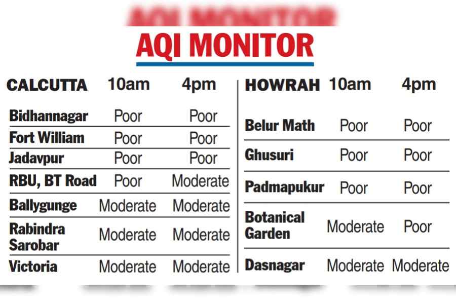 At 10am on Sunday, air quality was categorised as “poor” at Bidhannagar, Fort William, Jadavpur and Rabindra Bharati University (BT Road campus) in Calcutta, and at Belur Math, Ghusuri and Padmapukur in Howrah.