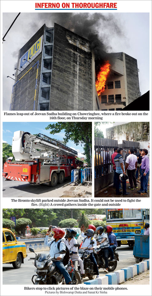 Chowringhee: Firefighters reached Jeevan Sudha building on Thursday morning with two hydraulic ladders. Only one of the ladders could make it into the compound. The other, the more sophisticated one, remained stationed outside on JL Nehru Road. Eventually, neither of the ladders could be used.
