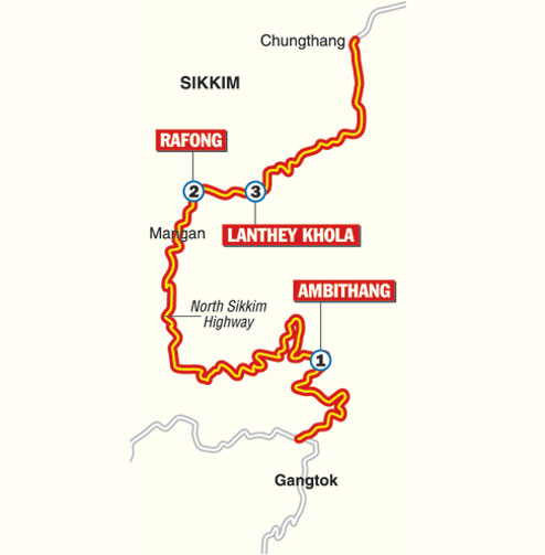 A landslide at Ambithang village, around 35km from Gangtok, damaged the North Sikkim Highway on Monday. North district collector Karma Bonpo said it would take around three days to repair the stretch between Gangtok and Mangan — a distance of 74km. The alternative road through Singtam and Dikchu is longer and is in a bad condition, sources said