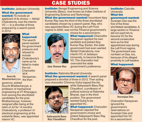 In some cases the government had not initially disapproved of the search panel’s choice as the academicians who topped the shortlists did not appear to be anti-Trinamul. “But after assuming office many of them started functioning in a way (read in a neutral way) that left the government and ruling party embarrassed,” said a teacher leader of Trinamul.