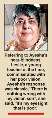 A day later, Leslie D’Gama, a former teacher of St. Xavier’s Collegiate School, shared an anecdote with us. Referring to Ayesha’s near-blindness, Leslie, a young teacher at the time, commiserated with her poor vision. Ayesha’s response was classic, “There is nothing wrong with my vision son”, she said, “it’s my eyesight that is poor.”