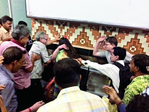 In these circumstances, I wondered what would happen if a young couple was spotted behaving rather freely. It was quite difficult to imagine the rows of faces that were arranged above and around me, bland, or self-engrossed, or in conversation, with many of them presumably belonging to the "gentleman" (bhadralok) class of Bengalis, erupting into fury, about anything at all. Even if they had, famously, on Monday evening, in the Metro, when they assaulted a young couple for being "obscene".