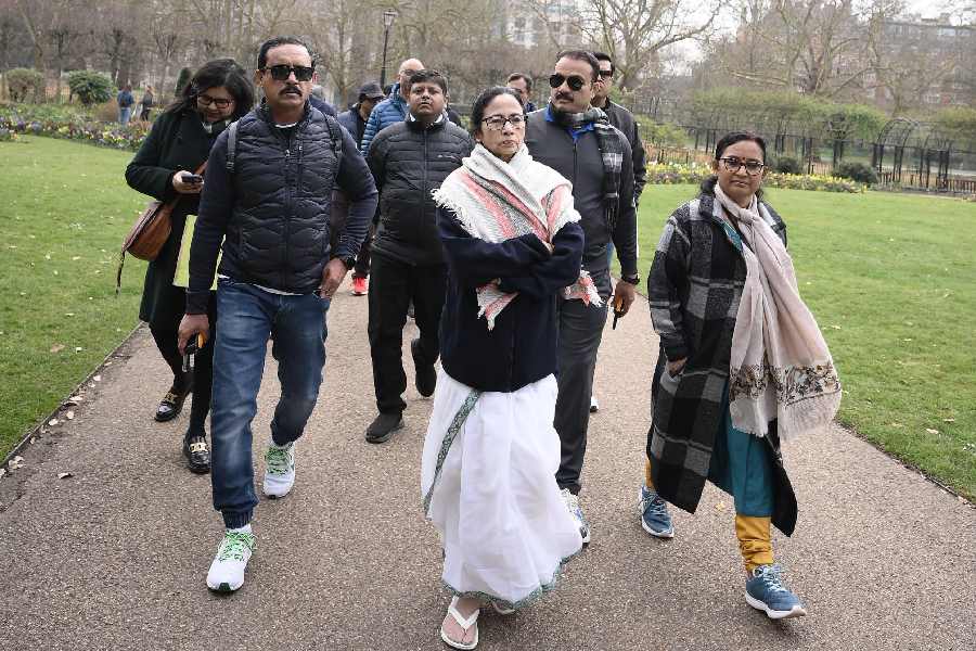 Banerjee, who is in the UK for a series of meetings, was heard urging those accompanying her to maintain her tempo as she strode through one of London’s most famous parks.