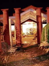 | Preparations are underway for the 400th edition of the Durga puja of the Sabarna Roy Chowdhury family in Barisha. In the foreground are the pillars of the cutchery where a deal with East India Company was inked. (Picture by Sudeshna Banerjee) |