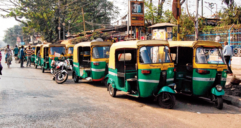 | Some of the autos that were off the road lined up beside Deshapriya Park. (Bibhash Lodh) |