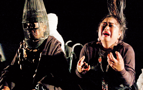 It’s not just the superb costumes and props (each sketched by Thiyam before being crafted out of simple things at the workshop of the repertory), the artistry is in the stance and gestures, the live music with indigenous musical instruments as well as the use of light and darkness. The location, dialect and costumes used in the play are all of Thiyam’s making. “I have invented a new tribe with new rituals, customs but they have elements of all tribal cultures.”