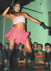 As the clubbers got into the groove, Geetal promised to do all that Madhuri did, minus the magic. The next act began an hour later with the highlight: Ek do teen? In the same pink short skirt with a short top and hair tied in a ponytail on one side of her head, she left the audience crying for more. On the bar top, Geetal danced her way amid the pink lights, set specifically for this Tezaab number with which the star was born.