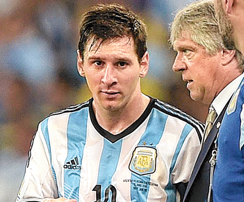 | RED-AND-GOLD TO BLUE-AND-WHITE WITH THE MAN - Julian Camino administering some vocal tonic to Lionel Messi during the half-time break of their opening match against Bosnia-Herzegovina. (AFP) |