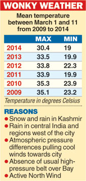Since 2009, the mean maximum temperature in Calcutta in the first 11 days of the March has been 34.3 degrees Celsius. The average maximum temperature this March has been 30.3 degrees Celsius, four notches lower.