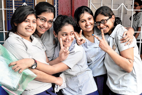 | HS examinees celebrate after getting their results in a city school on Monday. Picture by Anindya Shankar Ray |