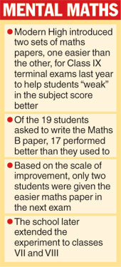 Modern High School for Girls last year introduced two sets of mathematics papers, one easier than the other, for its Class IX terminal exams as part of a strategy to help students "weak" in the subject score better and gain the confidence to catch up with their peers.