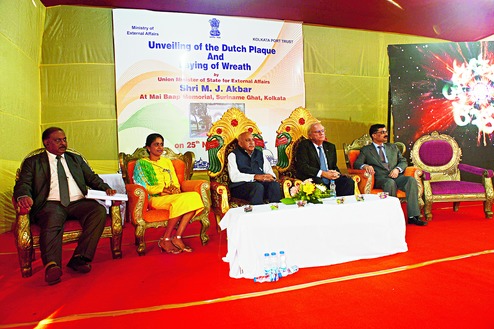 Minister of state for external affairs M.J. Akbar on Saturday unveiled a Dutch plaque on the base of the Mai Baap statue in Suriname Ghat during an event coinciding with the tiny nation's Independence Day. The memorial previously had plaques in English, Hindi, Bengali and Suriname.