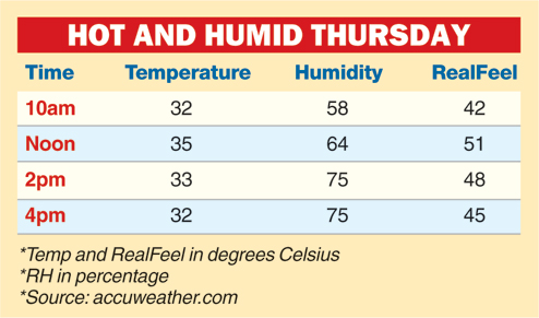 Noon was the most uncomfortable on Thursday when the temperature and humidity were both high at 35 degrees Celsius and 64 per cent, taking the RealFeel to 51 degrees Celsius. Later in the afternoon, it hovered between 46 and 50 degrees Celsius as the temperature came down to 33 degrees Celsius but the humidity increased to 75 per cent.