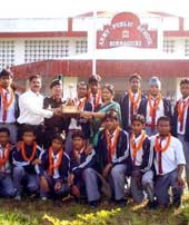 | Students of Army Public School Binnaguri with the hockey championship trophy and (right) Raj inspects the refurbished auditorium |