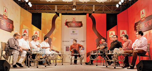 | (From left) Nepaldeb Bhattacharya, Arunava Ghosh, Suman Mukhopadhyay, Firhad Hakim, anchor Suman De, Chiranjit, Bratya Basu, Biplab Chatterjee and George Baker at the ABP Ananda Jukti Takko, partnered by The Telegraph. (Rashbehari Das) |