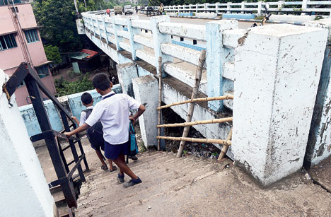 Two stairways lead to the busy overbridge from Mahabir Chowk in Liluah. Both are in a similar condition with yawning gaps in place of railings.