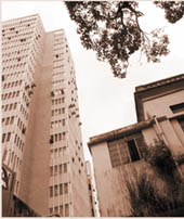 The space separating one highrise from another is so limited, one wonders if this was done to promote neighbourly feeling -- allowing the occupant of one building to shake hands with his friend in the building in the adjoining plot. This feeling of camaraderie between two next-door buildings is taken to its logical conclusion in the two leaning towers of Urbashi and Usha Kiran that tilt their heads to such an extent that they actually hug and kiss in mid-air.