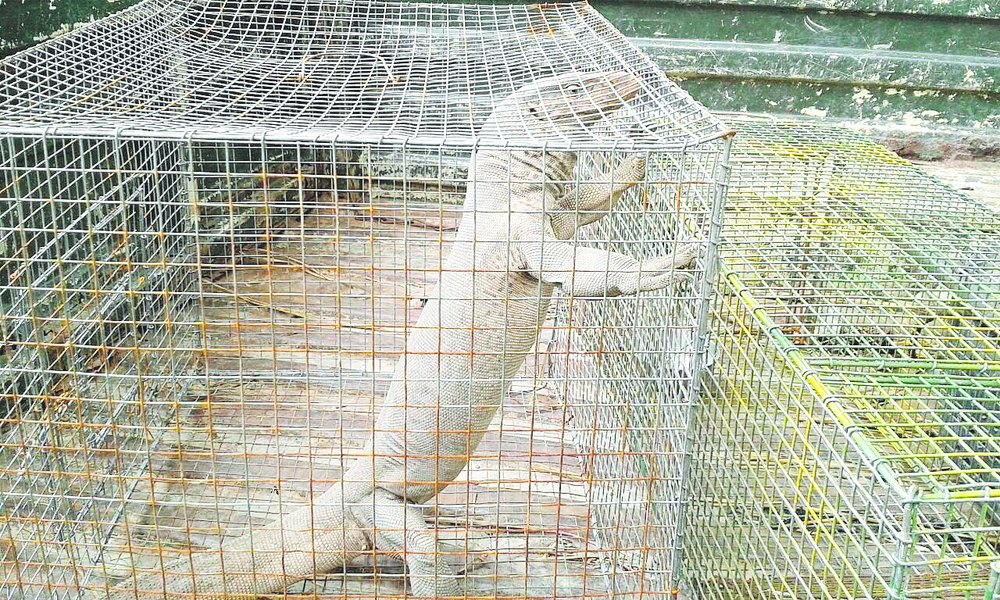 A monitor lizard rescued from the campus of La Martiniere for Girls on Sunday. Guards at the school spotted two monitor lizards, each around 3ft long, on the Beckbagan side of the campus. While one of them disappeared into a bush, the guards rescued the other, said a school official. The monitor lizard was kept in a cage that was given to the school by the forest department after a few civets were spotted on the campus a few months ago.Forest department officials later took the monitor lizard to the Rescue and Rehabilitation Centre in Salt Lake. 'The monitor lizard will either be handed over to the zoo or released in the wild,' said an official. Monitor lizards are not known to harm human beings.Two years ago, a tortoise was rescued from the school grounds