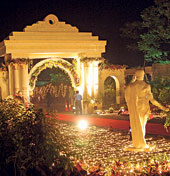 As in the pujas, there are themes for weddings. Eventure Events organised the wedding for the Chakrabortys, on a “Thai theme”. “We set up Thai figures and pillars in red and gold on a bamboo structure decked with white, yellow and red orchid. The waiters sported traditional Thai clothes and we flew down a Thai lady who sat and played a string instrument,” says Geetish Agarwal of Eventure Events.