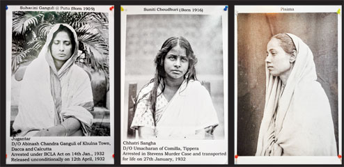 Next to her is the photograph of her friend, the 15-year-old Suniti Choudhuri, alias Meera Devi of Chhatri Sangh, “custodian of firearms”, who was in charge of training female members in lathi, sword and dagger play. She too was convicted and sentenced to transportation for life with Santi for the same murder. She looks straight at the viewer, her face determined, her hair parted in the middle and hanging loose, framing her attractive face.