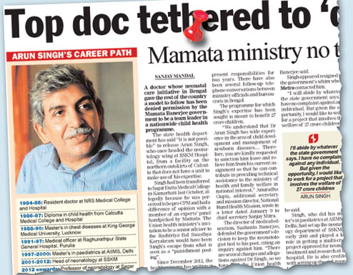 | The Metro report on May 7 on the Mamata Banerjee government’s refusal to release doctor Arun Singh |