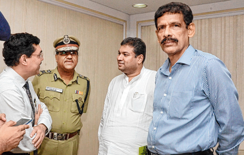 | (From right) Calcutta police chief Surajit Kar Purkayastha, The Bengal secretary general Sundeep Bhutoria, additional police commissioner Debasish Roy and Rupak Barua, group CEO of AMRI Hospitals, after the Pronam meeting at Belle Vue Clinic on Friday evening |