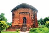 The charchala structure (where the four sloped roofs form a pinnacle) made of brick and facing south stands on a raised plinth. It is believed to have been built by Gandharba Roy in the 17th century, although the plaque containing information such as the name of the founder and the year of foundation has long been lost. The temple stands on a square base and is around 21 metres tall.