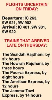 Air Sahara’s Calcutta-Delhi flight did not take off till 8 pm and the authorities were not sure it would take off at all. There is no information so far on the Delhi-Calcutta flight, scheduled to arrive at 7.30 pm.
