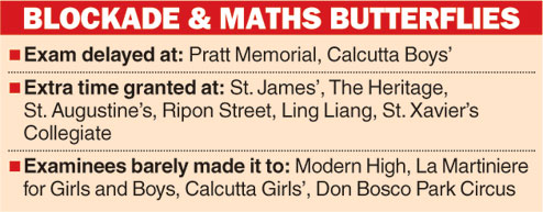 At least 20 examinees at Calcutta Boys’ reached well after the scheduled start. Yash Vardhan Agarwal called his mother at 1.15 from Park Circus to say “there is a 50 per cent chance” he would miss the exam.