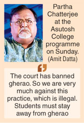 Chatterjee, an alumnus of Asutosh College, visited the institution to attend a programme marking the end of its centenary celebrations. The college has repeatedly witnessed gherao of the principal and other teachers by students, mostly backed by Trinamul Chhatra Parishad, over the past few years.