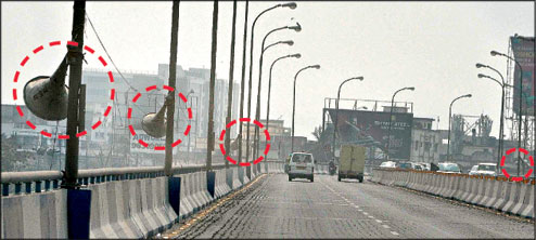 Apart from the lanes in Narayantala West, the stretch of VIP Road till Kaikhali is dotted with loudspeakers at short gaps.