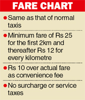 The taxis booked through the app will run on meter and the fares will be same as that of normal taxis. But Rs 10 will be charged extra as convenience fee.