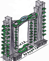 | The sculptured “Deya” or cloud cradled between the twin towers of Atmosphere that will come up off Science City. (Above) An artist’s impression of the tubular community centre “Deya” with its four levels, the topmost being the party deck followed by a jogging track and a swimming pool |
