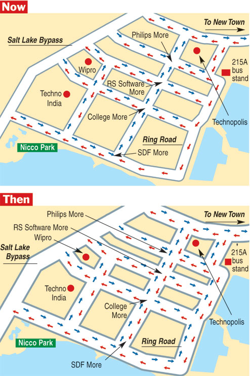 The stretch from SDF building to Technopolis is now one-way. Cars will be able to move towards Technopolis but not the other way back. The College More junction lies on this stretch too. “Traffic flow has been made uni-directional here. Vehicles headed towards Technopolis will be allowed to ply along both the flanks of the road,” said Nishat Pervez, deputy commissioner, headquarters, of the Bidhannnagar Commissionerate.