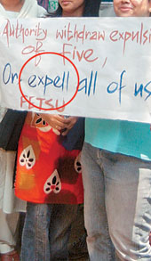 | SPELL CHECK: Jadavpur University agitators challenge the authorities to expell (sic) them, in solidarity with the five students thrown out on Tuesday. Picture by Aranya Sen |