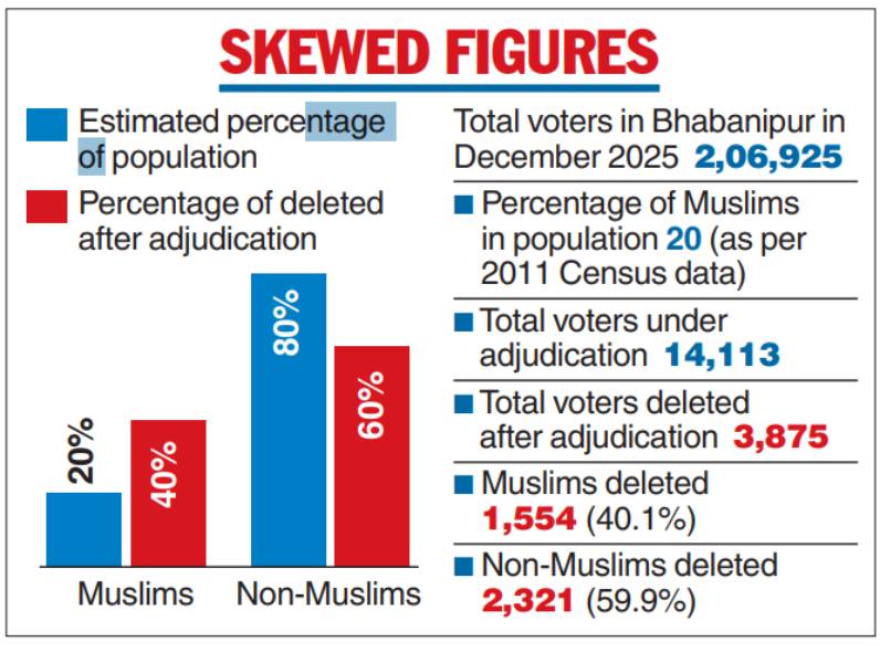 The percentage of Muslims removed after adjudication from the revised electoral rolls of Bhabanipur is double the community’s share of the segment’s population, a study has shown.