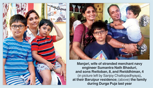 Sumantra, 40, was to dock in Calcutta on September 25, just in time to reach his Baruipur home and get into the festive groove with Manjari and their sons Rwitoban, 8, and Rwiddhiman, 4. Durga Puja is over but he still does not know whether he will be back home for the festivals to follow.