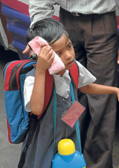 | One of the nursery students alights from a school bus at Mahadevi Birla Shishu Vihar looking exhausted on Tuesday. Picture by Bishwarup Datta |