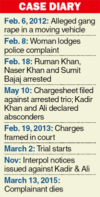 The alleged gang rape had occurred around 3am on February 6, 2012, according to the complaint registered two days later. The woman said she had been raped by five men in the rear seat of a moving car after accepting a lift from a man she had befriended at the nightclub.