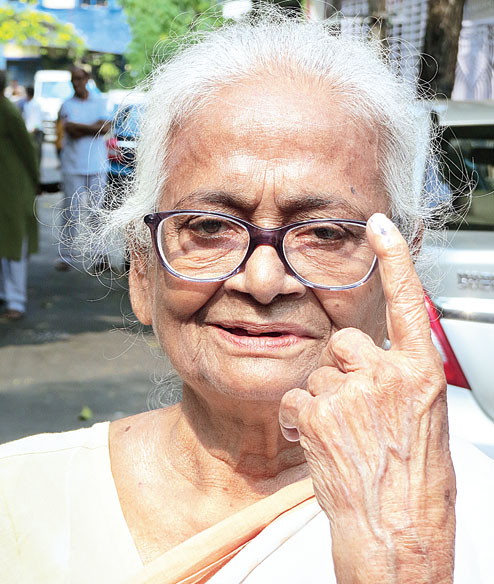 B.R. Das, 92, Barun Dutta, 84, and Asit Maitra, 92, after voting at St. Francis Xavier School in Purbachal. Das and Dutta had come on their own while Maitra, who had a pacemaker installed a while back, was accompanied by a domestic help. “If people are unhappy with the way things are run, today is the day to act,” said Maitra.