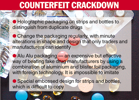 Pharma companies have started their own anti-counterfeit strategy. For instance, city-based Herbicure Pvt Ltd (asthma and liver cure products) has, of late, started monitoring drug stores and is marketing bottles with special wraps and going in for embossed designs for blister-pack capsules.