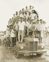 | A human pyramid of football-lovers atop a black maria. (Below): A tram ride |
