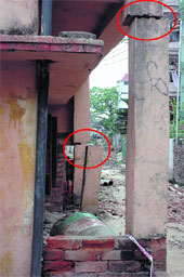 | Pillars of a house on Maharani Indira Devi Road have cracked, and residents of the area blame the sewerage pipe-laying work in their locality. Picture by Sanjoy Chattopadhyaya |