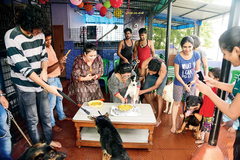 Shonamoni, an Indian dog brought in by Jaidip Banerjee, did the honours of cutting the pie along with Dutta Roy. Several dogs had by then surrounded the pie hungrily. “Our GSD, Dogtor Dre, is fussy with food,” said Arijit Sett as his mother Sujata tried in vain to feed him. Sujata couldn’t help but notice Bubulu, who had come up close, smacking his lips. “Would you like a bite?” began Sujata and Bubulu had engulfed the entire slice before she could finish her sentence!